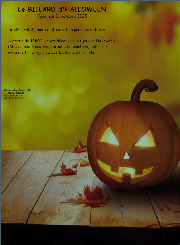 Un goûter pour découvrir le billard français, avec une petite initiation et des jeux spéciaux (La chasse aux monstres, la bataille de zombies et dehors la sorcière !)...